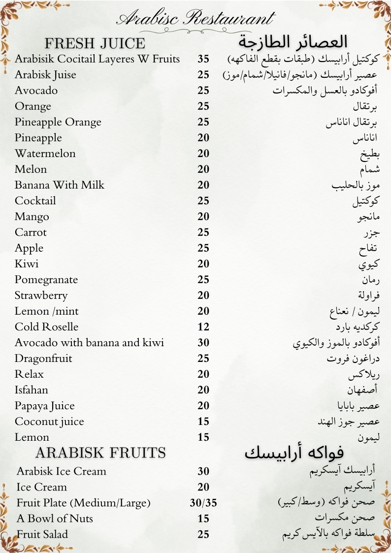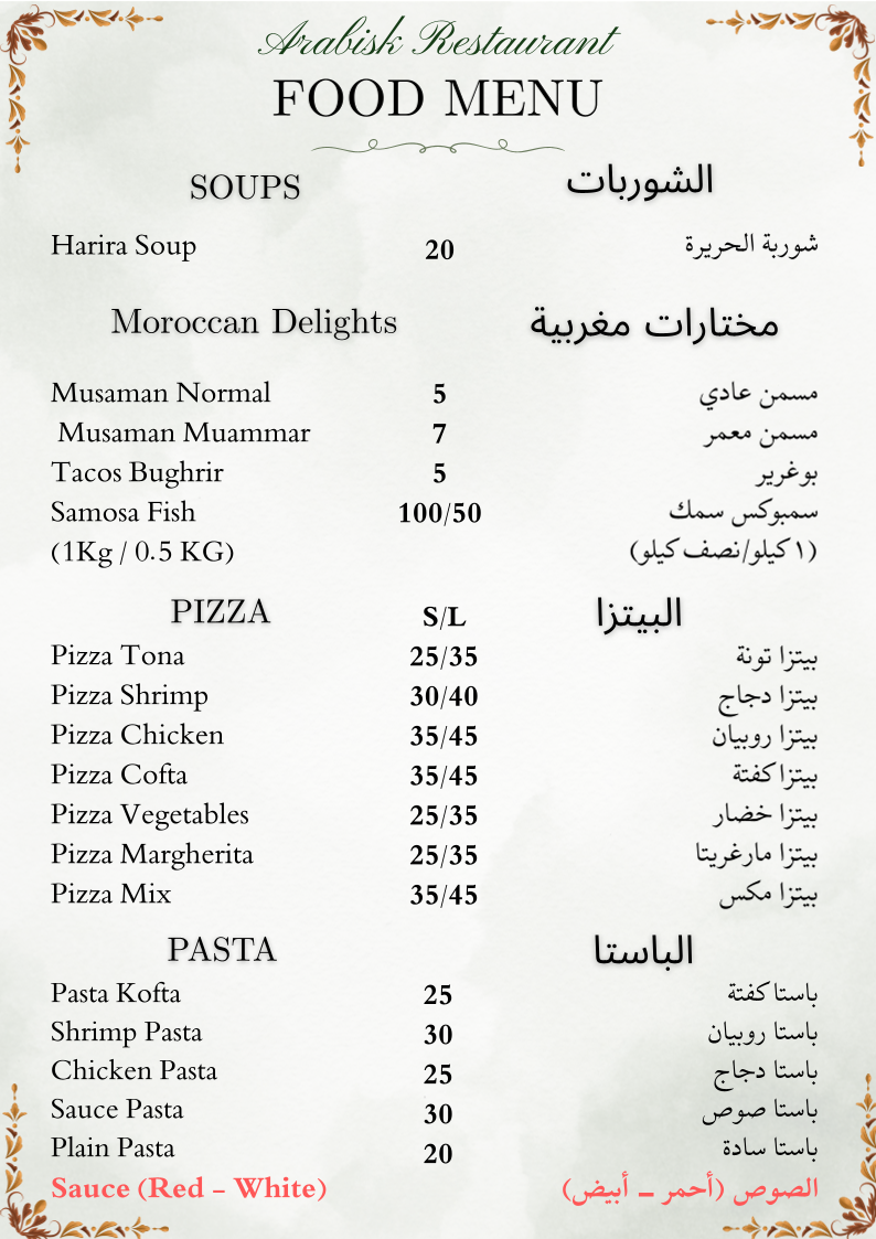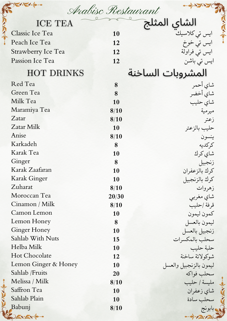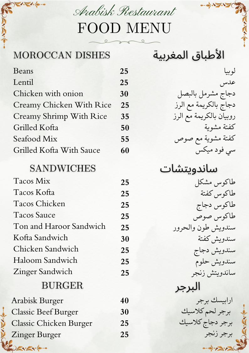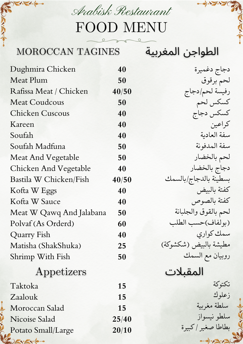 From a reviewer’s perspective, the menu at Arabisk Restaurant And Cafe, located at 26 Al Nuwawir St - Al Juwais - Ras Al Khaimah - United Arab Emirates, reflects a focused and authentic approach to Middle Eastern and North African comfort cuisine. A standout highlight is the Moroccan tagine selection, especially طاجين مغربي: طاجين لحم برقوق, a classic slow-cooked dish that showcases tender meat braised with sweet prunes in a richly spiced sauce. This dish represents the heart of Moroccan culinary tradition, balancing savory depth with gentle sweetness and aromatic warmth. Rather than overwhelming diners with an extensive list, the menu emphasizes quality, heritage, and careful preparation, making each item feel intentional and culturally rooted. As a conclusion to the overall menu experience, Arabisk Restaurant And Cafe presents food that feels homely yet refined, ideal for guests who appreciate authentic flavors and traditional recipes prepared with care.