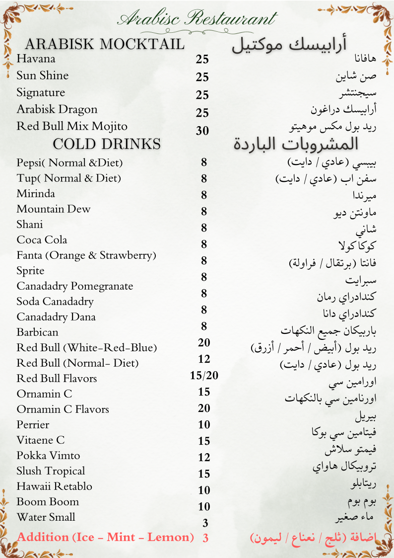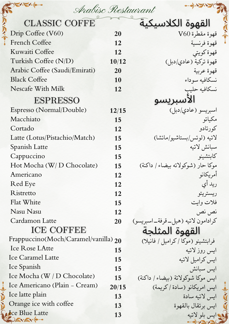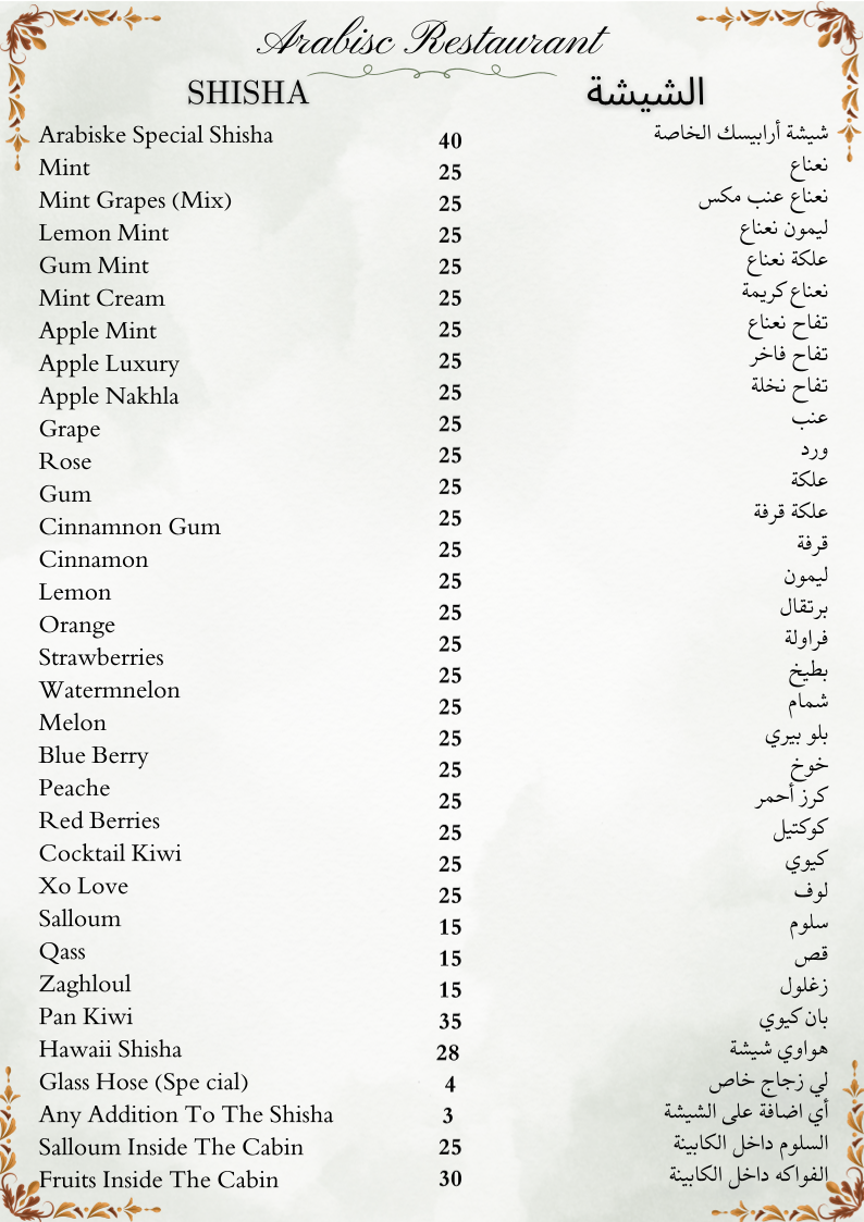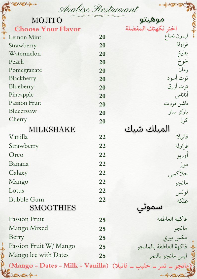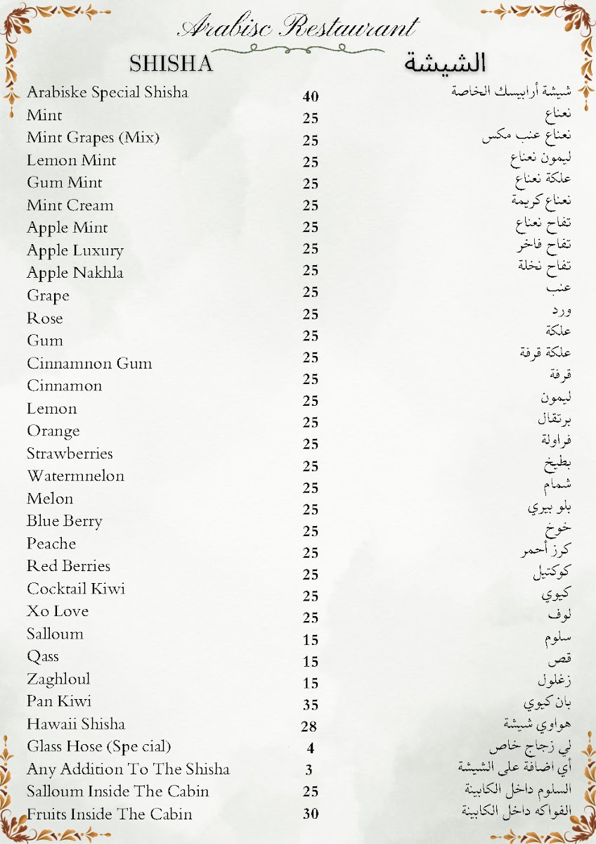 From a reviewer’s perspective, the menu at Arabisk Restaurant And Cafe, located at 26 Al Nuwawir St - Al Juwais - Ras Al Khaimah - United Arab Emirates, reflects a focused and authentic approach to Middle Eastern and North African comfort cuisine. A standout highlight is the Moroccan tagine selection, especially طاجين مغربي: طاجين لحم برقوق, a classic slow-cooked dish that showcases tender meat braised with sweet prunes in a richly spiced sauce. This dish represents the heart of Moroccan culinary tradition, balancing savory depth with gentle sweetness and aromatic warmth. Rather than overwhelming diners with an extensive list, the menu emphasizes quality, heritage, and careful preparation, making each item feel intentional and culturally rooted. As a conclusion to the overall menu experience, Arabisk Restaurant And Cafe presents food that feels homely yet refined, ideal for guests who appreciate authentic flavors and traditional recipes prepared with care.